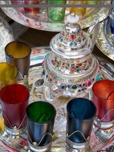 Juego para té completo, tetera y bandeja con detalles de vidrio de colores y vasos de vidrio multicolor